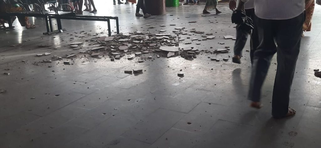ರವಿವಾರದಿಂದ ಸುರಿಯುತ್ತಿರುವ ಮಳೆ ಸೋಮವಾರವೂ ಮುಂದುವರಿದ ಹಿನ್ನೆಲೆಯಲ್ಲಿ ಮೇಲ್ಚಾವಣಿ ಹಸಿದು ಸಿಮೆಂಟ್ ಪದರು ಉದುರಿದೆ. ಬಸ್ ನಿಲ್ದಾಣದ ಪ್ರಾಂಗಣ 6 ರಲ್ಲಿ ಬಸ್ ಕಂಟ್ರೋಲರ್ ಕುಳಿತುಕೊಳ್ಳುವ ಸೀಟಿನ ಪಕ್ಕದಲ್ಲೇ ಸಿಮೆಂಟ್ ಬಿದ್ದು ಆತಂಕದ ವಾತಾವರಣ ನಿರ್ಮಾಣವಾಗಿತ್ತು.